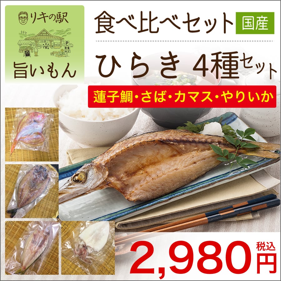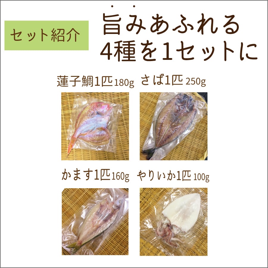 原材料名:《さば開き》さば、食塩《蓮子鯛開き》蓮子鯛、食塩《カマス開き》カマス、食塩《やりいか》やりいか